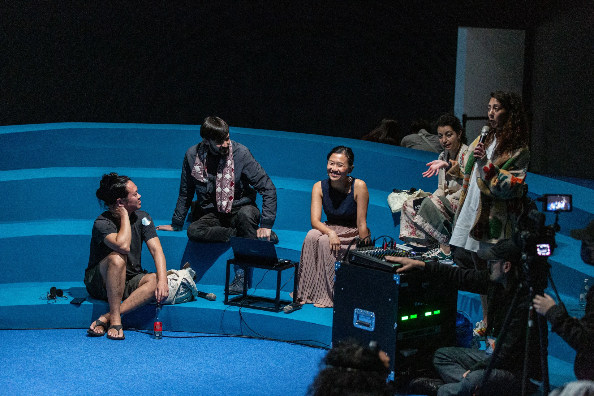 In videos of the events, available on Youtube, the Music Room has an oceanic quality. Turquoise felt-like fabric covered the floor as well the wood ovaloid structure that defined a loose theater-in-the-round and served as both stage and stadium-style seating. The design was by AAU ANASTAS Studio, founded by Palestinian architects Elias and Yousef Anastas. Speakers, performers, and audience members bob up and down on cresting turquoise waves amid a vast darkness beyond the spotlights. In part because the seats lacked lumbar support, many attendees leaned forward and appeared to be huddling together, staving off the emptiness that surrounds them.