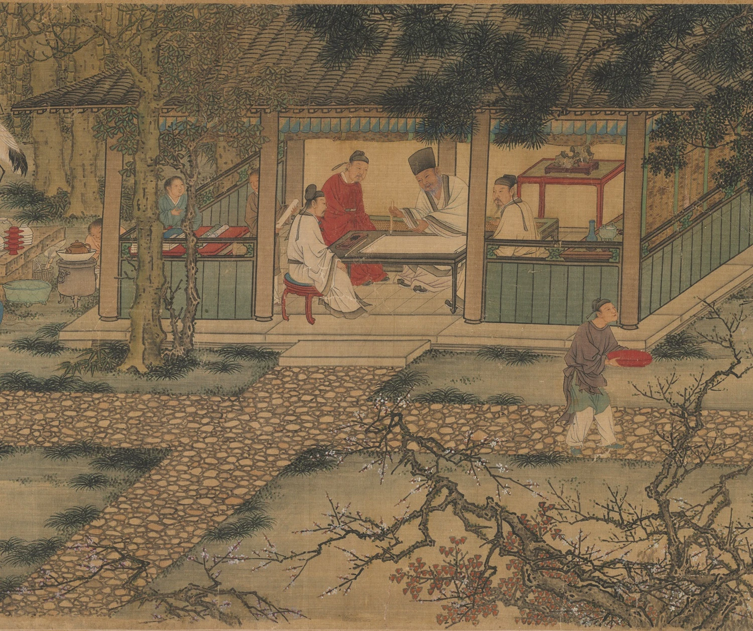 Signs of these endeavors at mirroring nature have been found in paintings throughout Chinese history. In the nearly five-foot-wide ink-and-pigment scroll painting, The Nine Elders of the Mountain of Fragrance, produced during the Ming Dynasty around the mid-fifteenth century, it seems as though the painter, thought to be Xie Huan, was willfully directing the viewer’s gaze to focus on a scholar’s rock amid a sprawling pictorial background. The small stone, set on top of a table edged with a radiant red, was strategically situated among a wider constellation of similarly rosy elements that orbit around it. The scholar’s rock functions as a mise en abyme within the painting's expansive, sublime allure. Is it possible that this scene of nature contained within a tabletop display is connected to the human desire that later led to photography? From an oblique, elevated, and omnipotent vantage, the artist renders a garden scene, itself a vision of constructed nature. As part of this setting, the scholar’s rock becomes not only a link within the long progression of other pictorial processes that allow for the experience of seeing to be encompassed, but also a proto-photographic fragment that speaks to the human urge to give thought to what is observed in order to locate ourselves within the world.