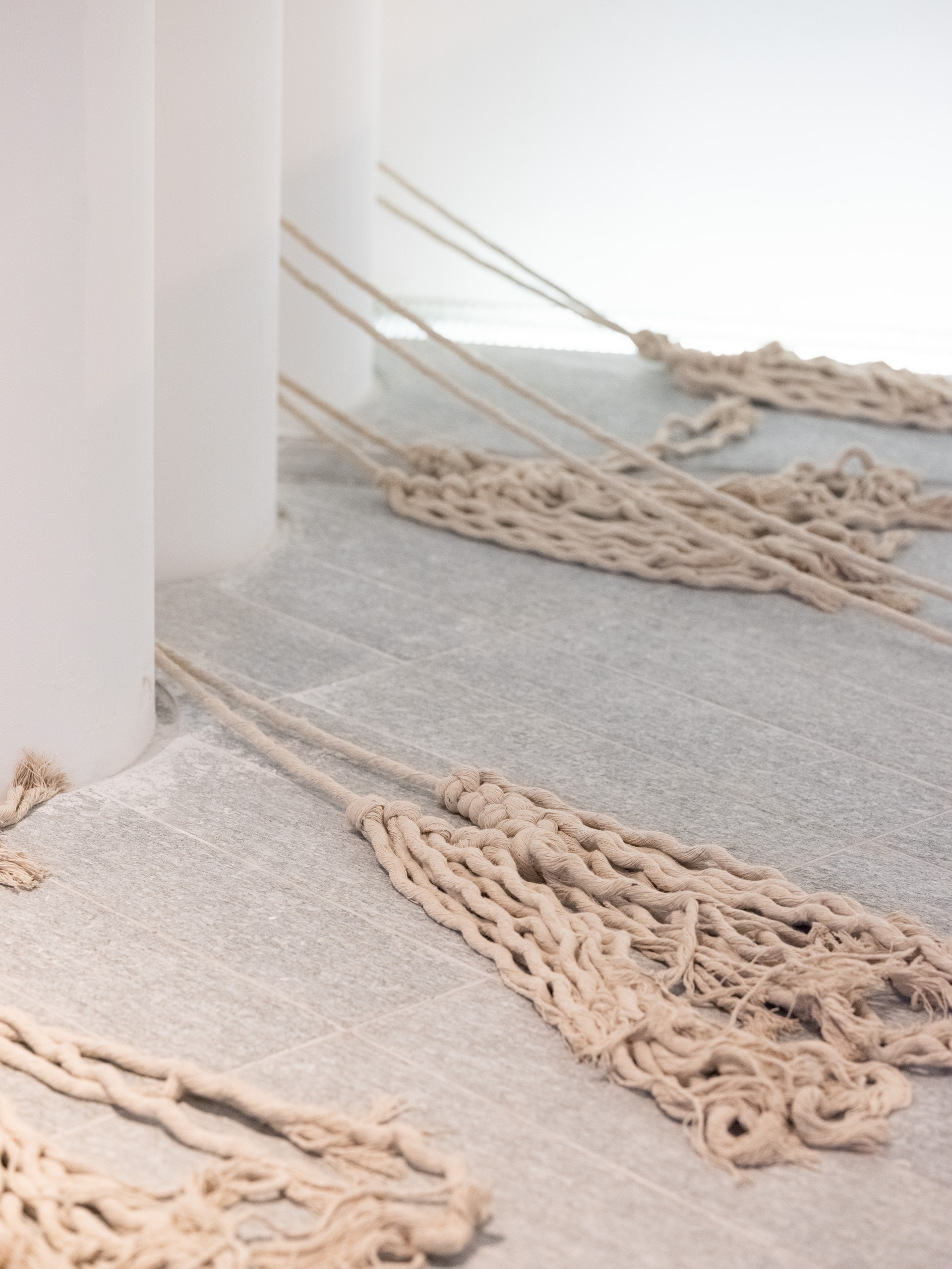 作品中的粗繩形態經過緩慢、重複的行為塑形而成——歷經層疊、解開與重新構築的過程。透過這件裝置,藝術家旨於營造一個供人深入沉思的場域。作品名稱《加重停頓》鼓勵觀者駐足休憩,感受自身的重量,全然專注於當下——無論是獨處或與他人共處。