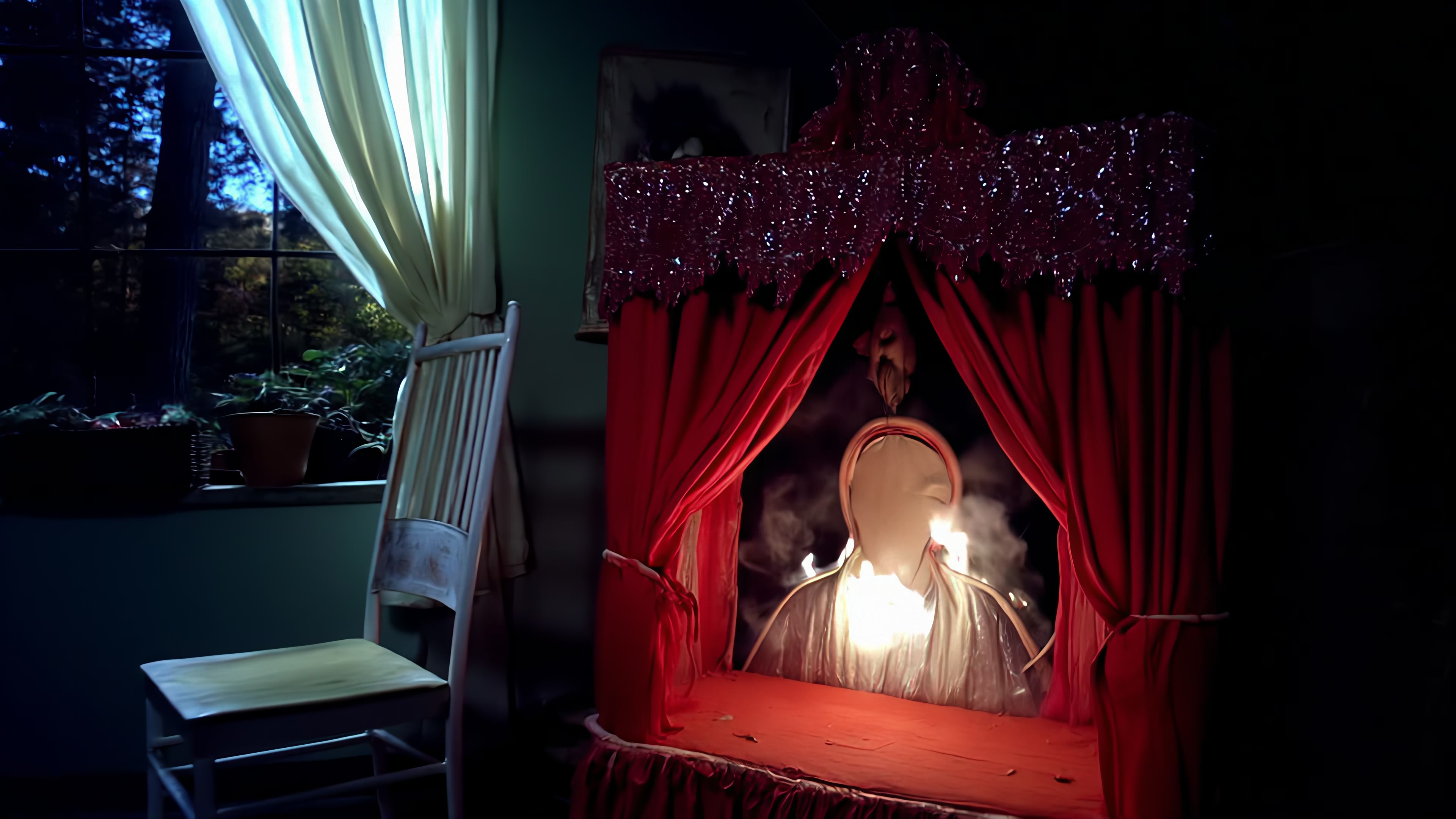 兩個電視螢幕,一高一低,懸掛在大型鷹架兩側。LED燈從鷹架的金屬支架內發出微光。影片引領我們穿梭於超現實景觀——遊走於天界與冥界之間。這段旅程始於荒蕪的冬日景觀,最終將我們帶入地底深處。這部錄像作品是藝術家獻給逝去摯友的追思之作。