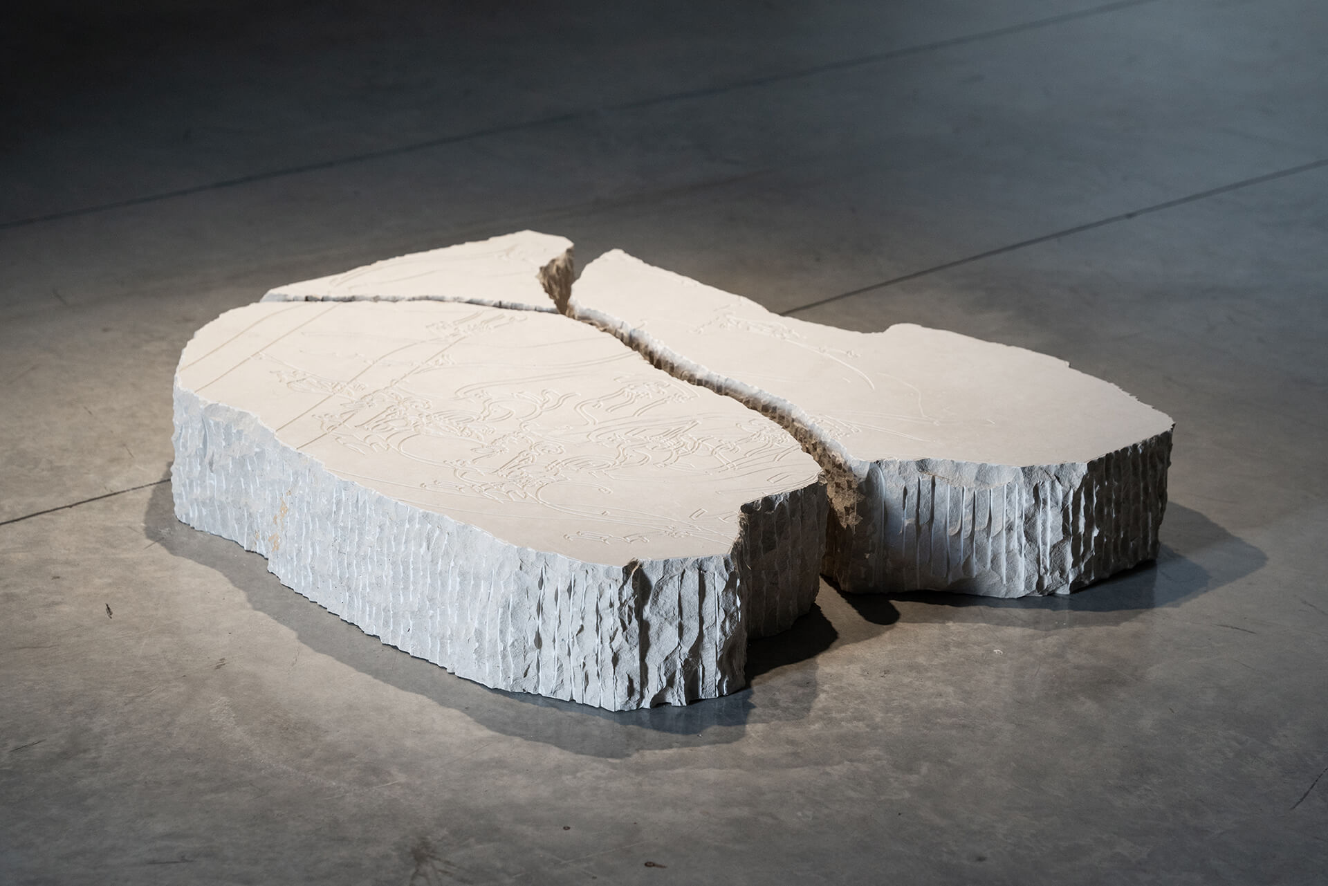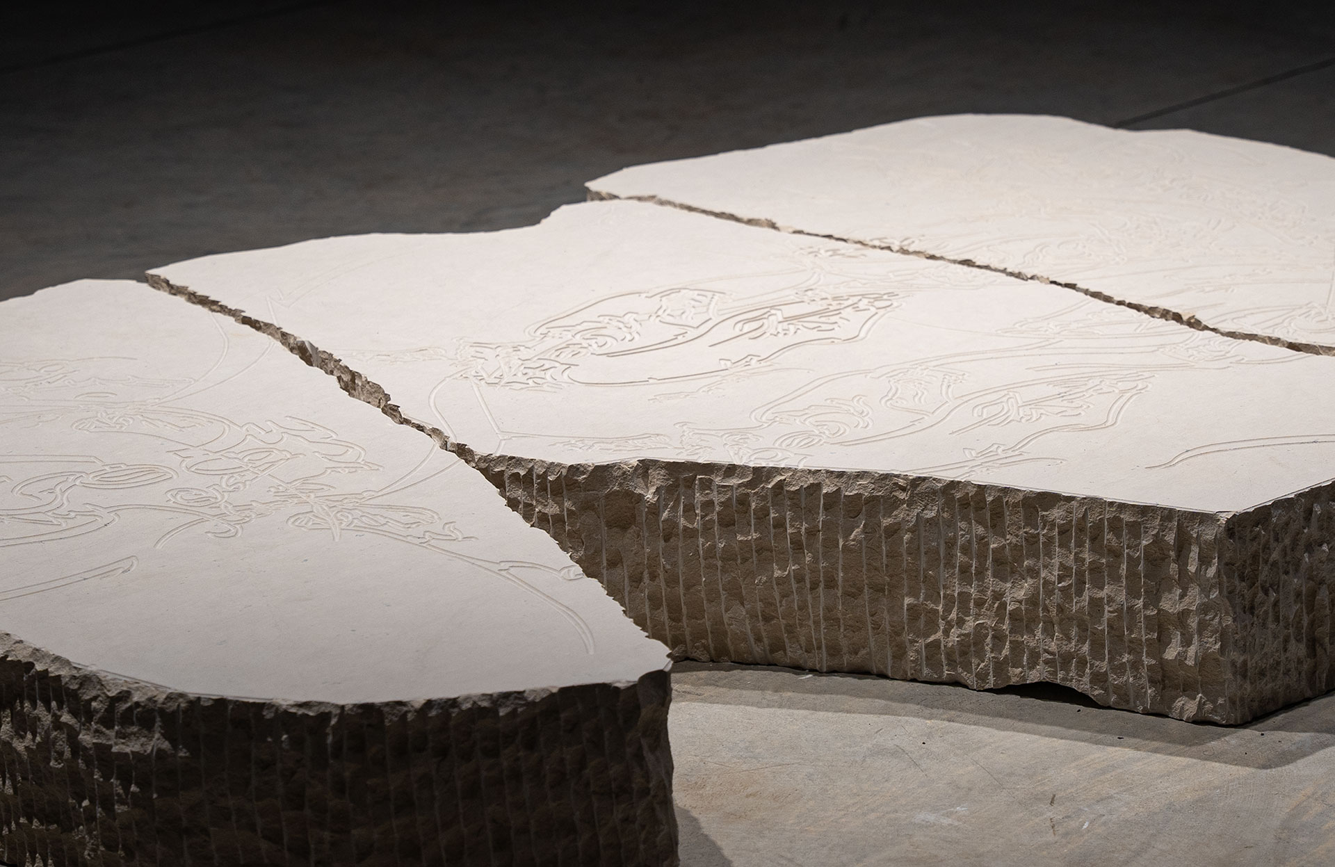 《Ya’aburnee (يقبرني) - 未譯碎片 I 及 II》為大理石雕塑,藝術家在其上雕刻紋樣,莫尼亞.班.哈穆達創作的圖案,重現了她在突尼西亞開羅安(Kairouan)一座穆斯林公墓中,通往家族墓地的路線。作品的靈感源於羅塞塔石碑等古文物,其呈現的裂痕與雕鑿的文字,暗示這是一件意義佚失的殘片。作品名稱「Ya’aburnee」在黎巴嫩阿拉伯語中可以直譯為「你埋葬我」——一句表達深切愛意與悲慟的話語。