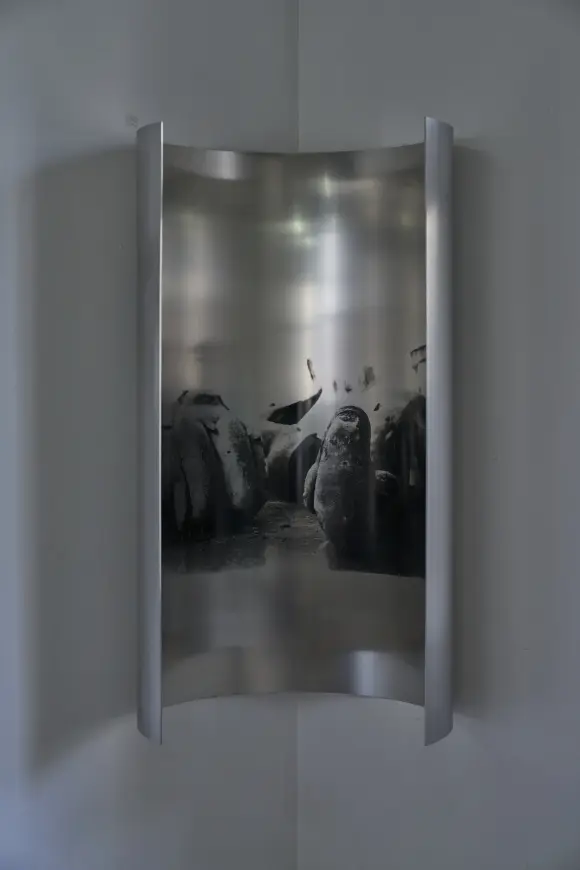 《光滑的靜物No.7》是一幅絹印作品,印製在弧形不鏽鋼板上,並以捲曲的圓柱形狀固定於牆面。作品圖像取自于吉工作室,呈現了雕塑碎片的堆疊。